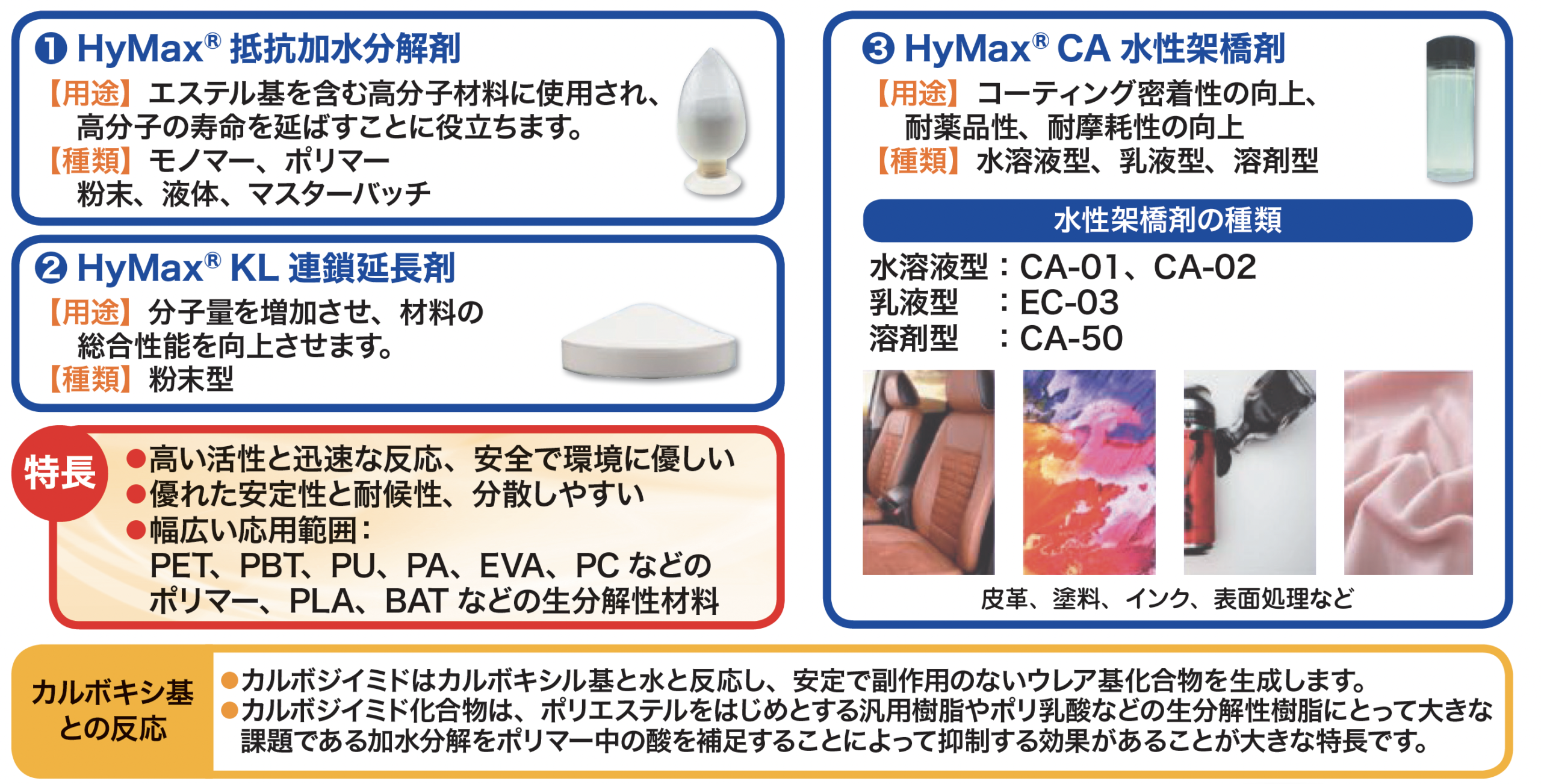 ポリカルボジイミドとは、分子中に「-N=C=N-」で表されるカルボジイミド基を有するポリマーのことを言い、ユニークな特徴を持っています。