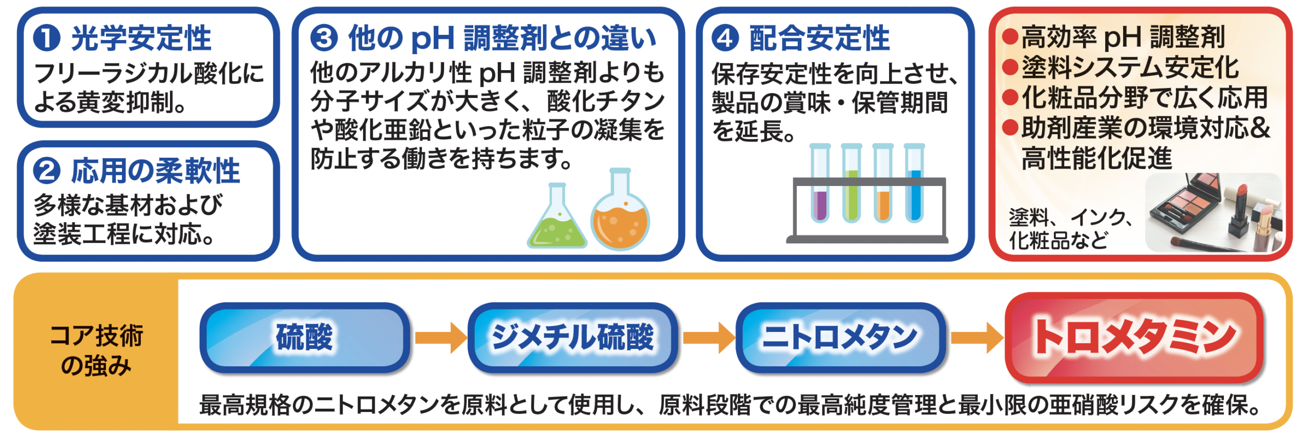 トロメタミンは、環境に優しいpH調整剤および機能性助剤として、水性塗料、インク、化粧品等において重要な役割を果たし、業界の低VOCs・高性能化の推進に貢献しています。